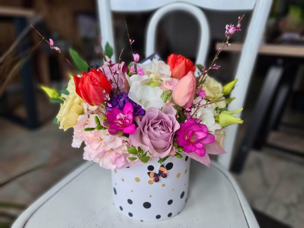 • Aranjamentul Butterfly este alcătuit din hortensie, frezii, lalele, eustoma, trandafiri, robusta,