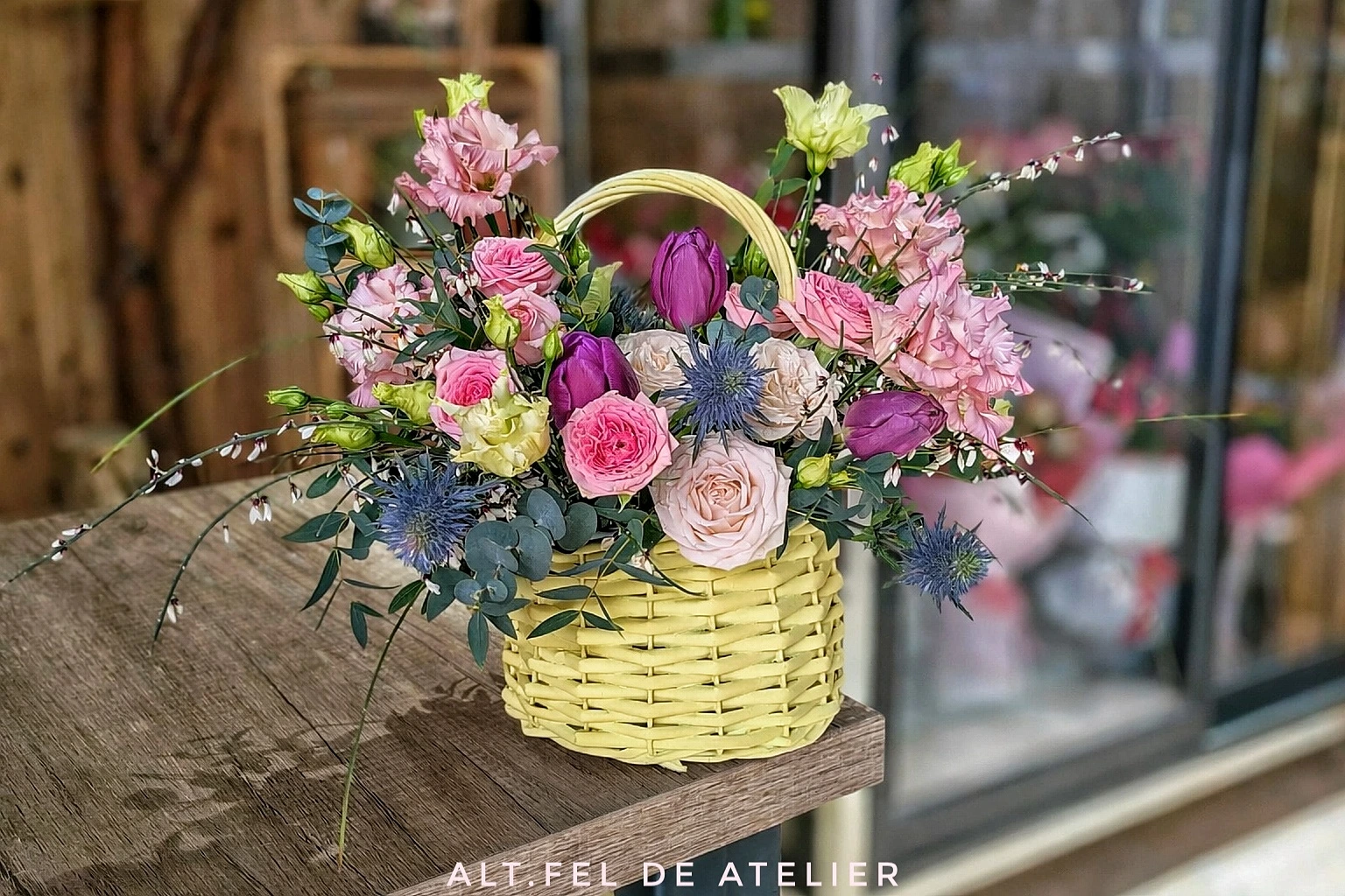 Compoziţie: 2 eustoma, 3 mini trandafiri, 3 lalele, 1 eryngium, 1 gunni, 2 ginster, cos nuiele, accesorii.