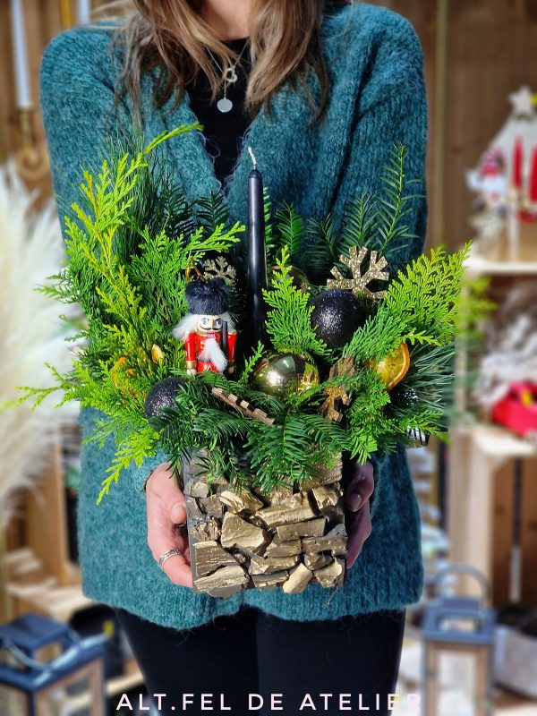 Aranjament de Craciun din brad natural, accesorizat cu globuri, figurine, si alte accesorii specifice sezonului rece.