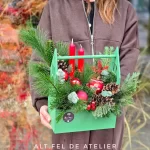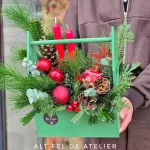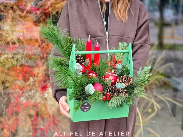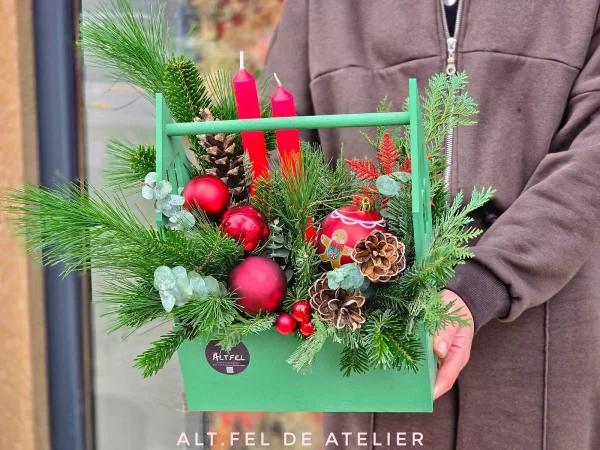 Aranjament de Craciun din brad natural, accesorizat cu globuri, bumbac, figurine, si alte accesorii specifice sezonului rece.