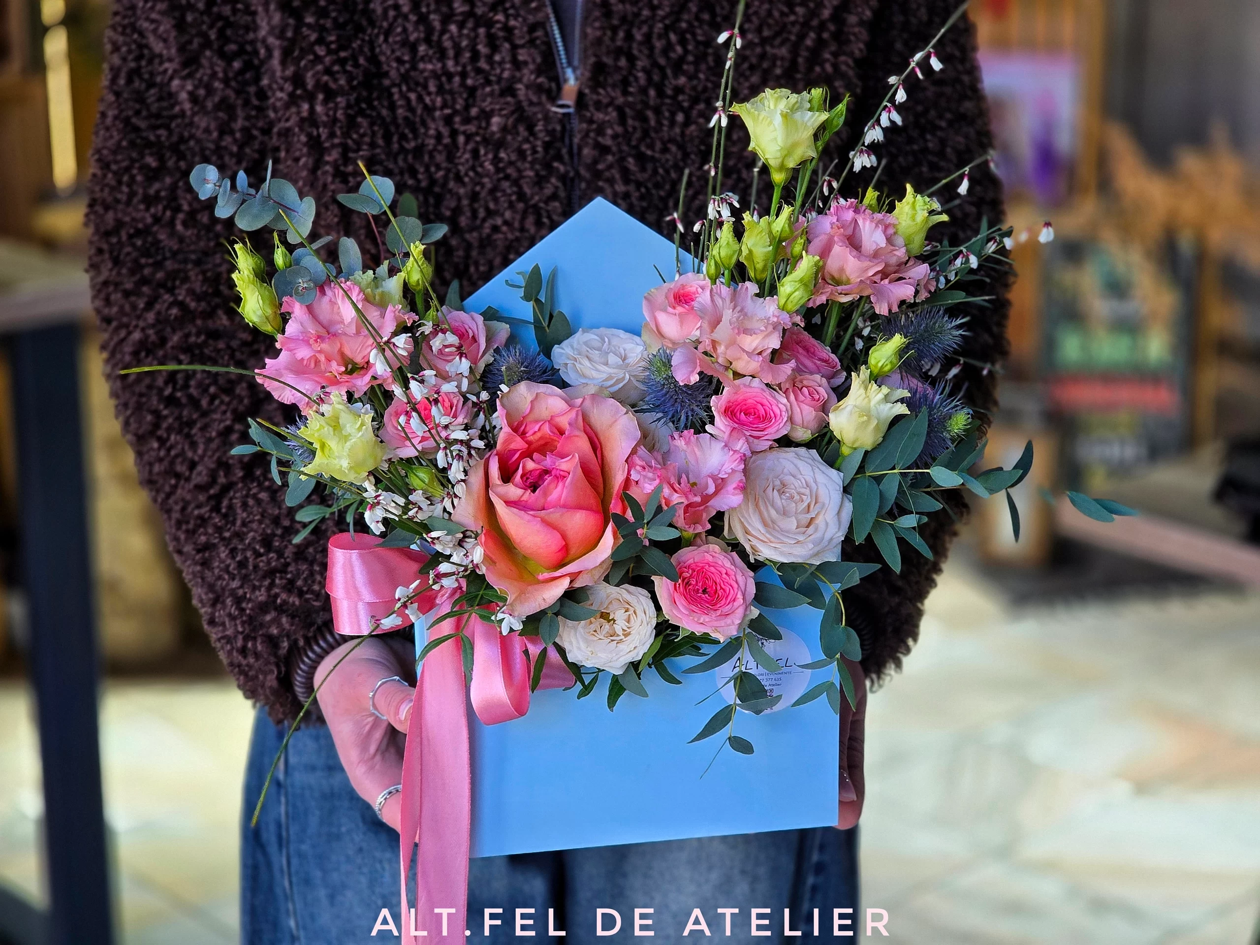 Compoziţie:1 trandafir, 1 eustoma, 3 mini trandafiri, 1 eryngium, insertie verdeata, cutie carton, burete.