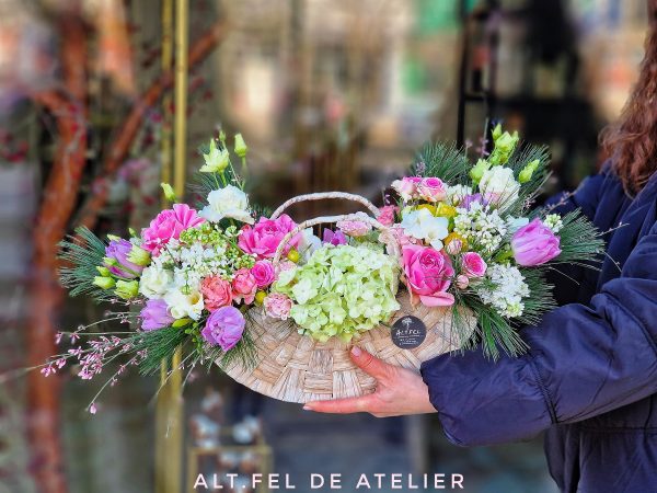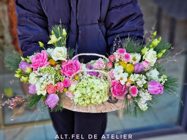 Compoziţie: Eustoma, hortensie, trandafiri, mini trandafiri, lalele, ginster, pistache.