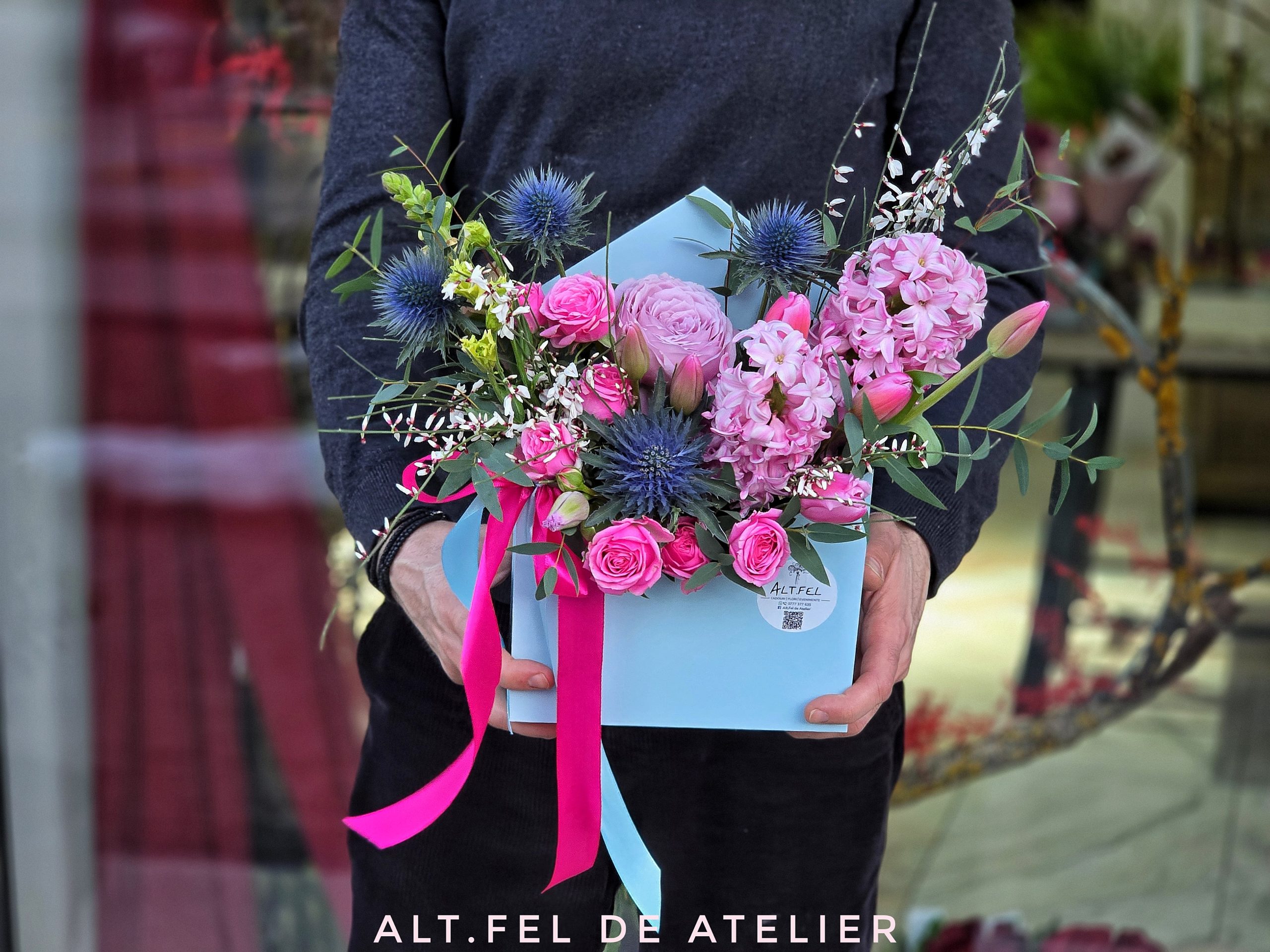 Compoziţie: 1 trandafir, 5 lalele, 2 zambile, 1 mini trandafiri, 1 eryngium, ginster, insertie verdeata, cutie, burete.