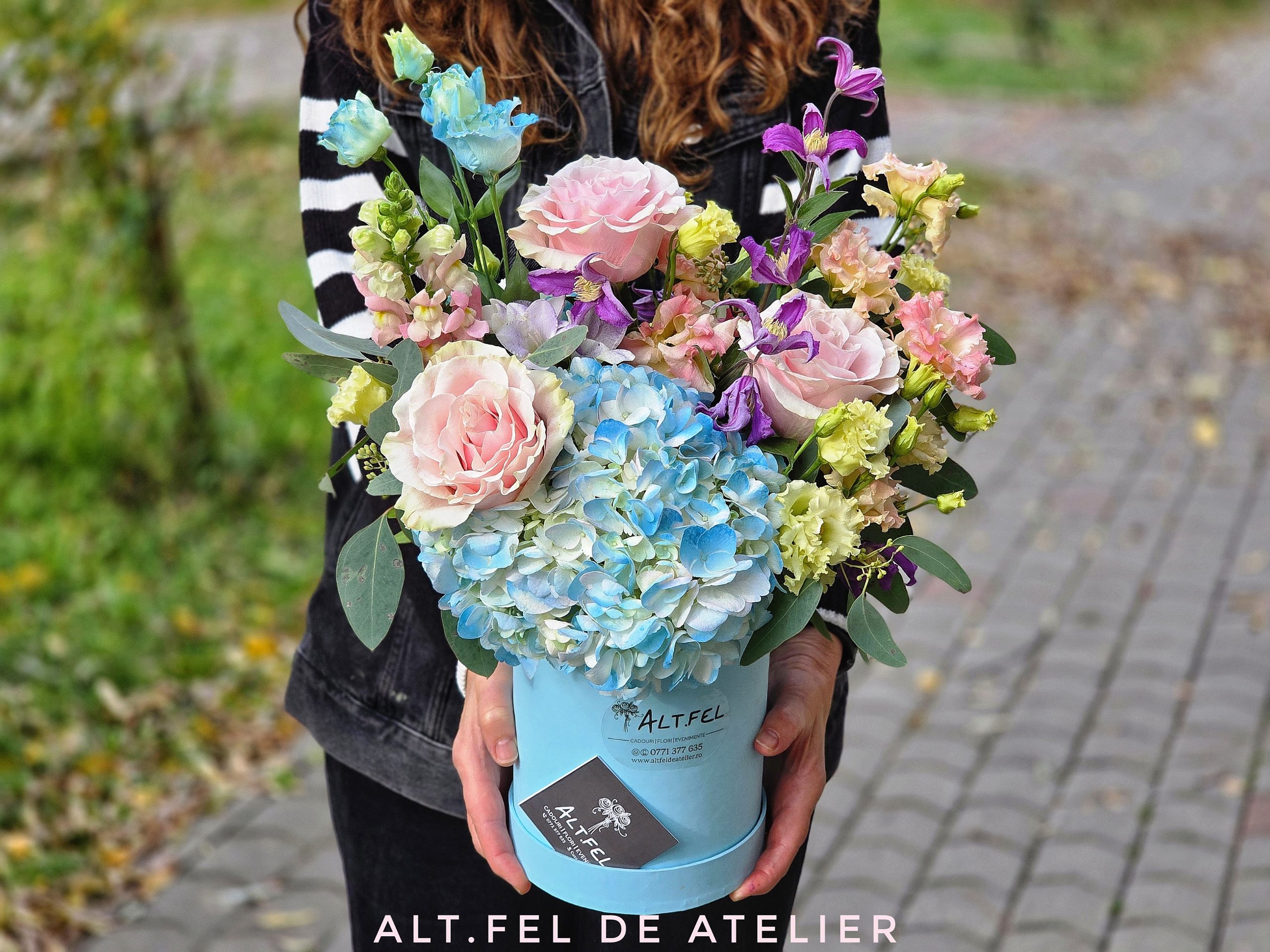 Compoziţie: hortensie, eustoma, tradafiri, clematis, robusta.
