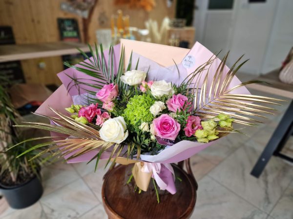Buchetul „Amalfi” este alcătuit din hydrangea, eustoma, mini trandafiri, insertie verdeata