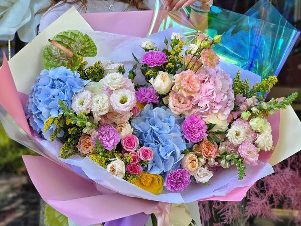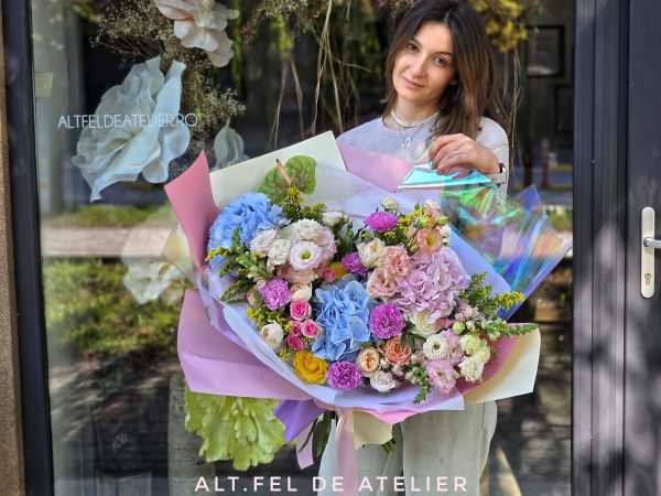 Compoziţie: Hortensie x 3, trandafiri, mini rose, eustoma, antirrhinum, anthurium, verdeata