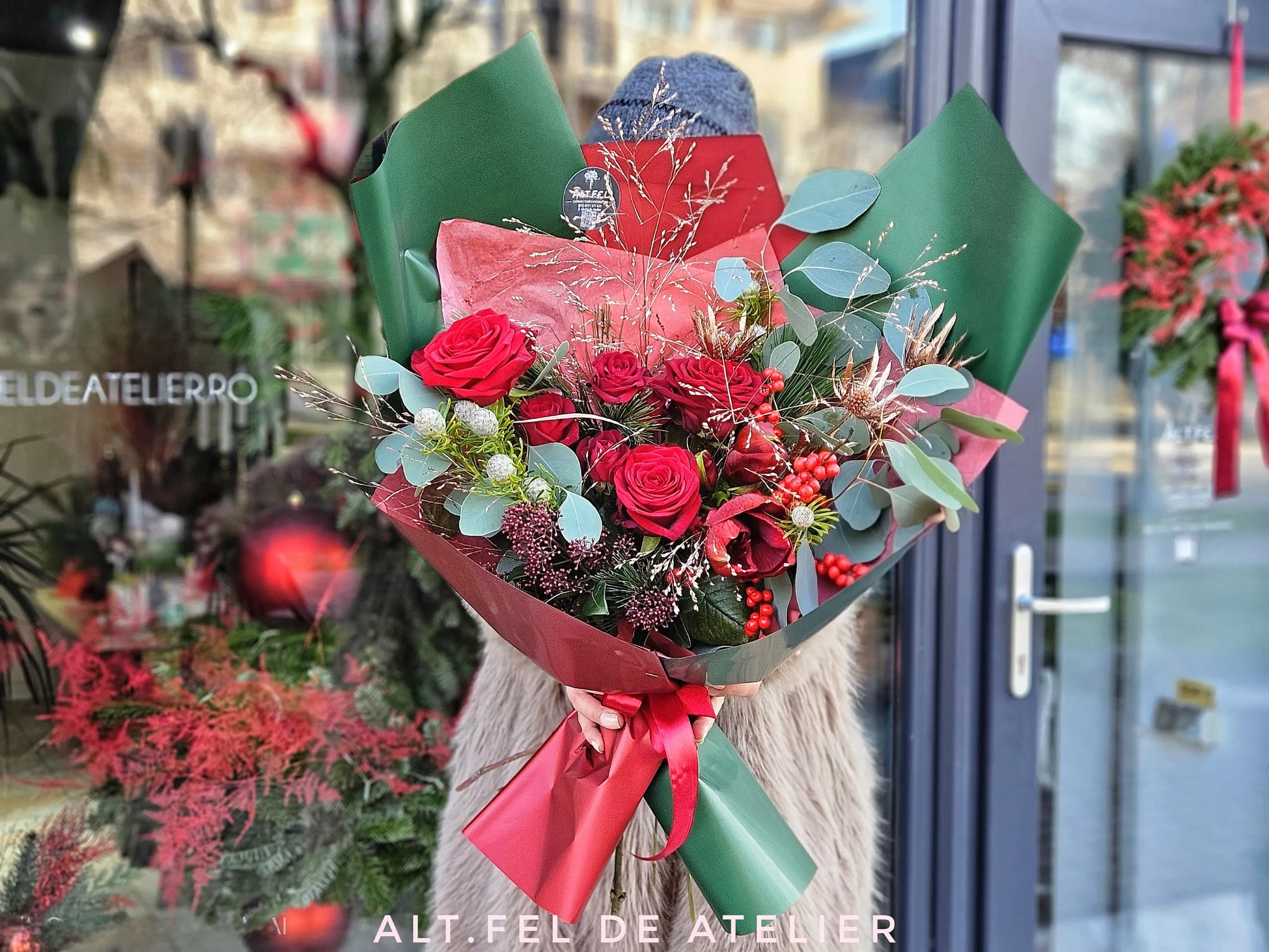 Buchet Winter fantasy este alcătuit din amaryllis, trandafiri, ilex, mini trandafiri, panicum, eryngium, skimmia, eucalipt
