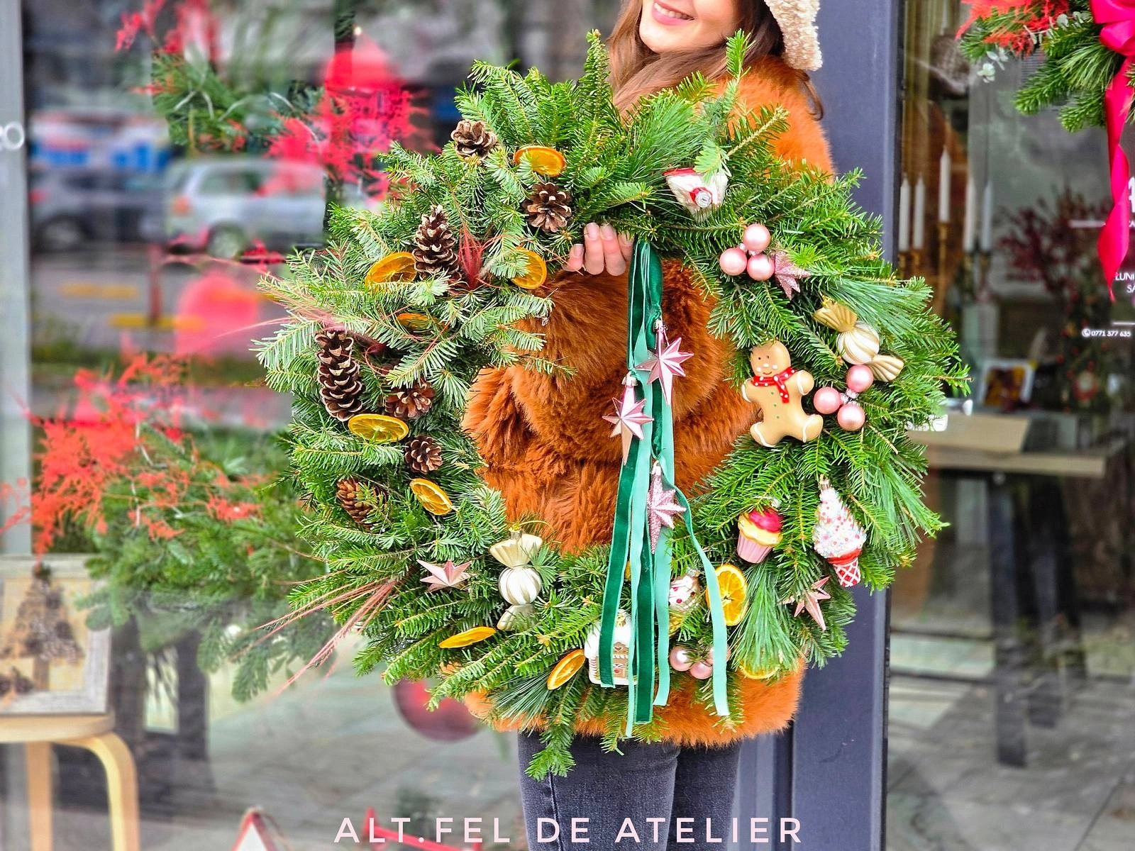 Coronita de Craciun este realizata cu crengi de brad natural, accesorizata cu figurine, globuri si alte accesorii specifice sezonului rece.