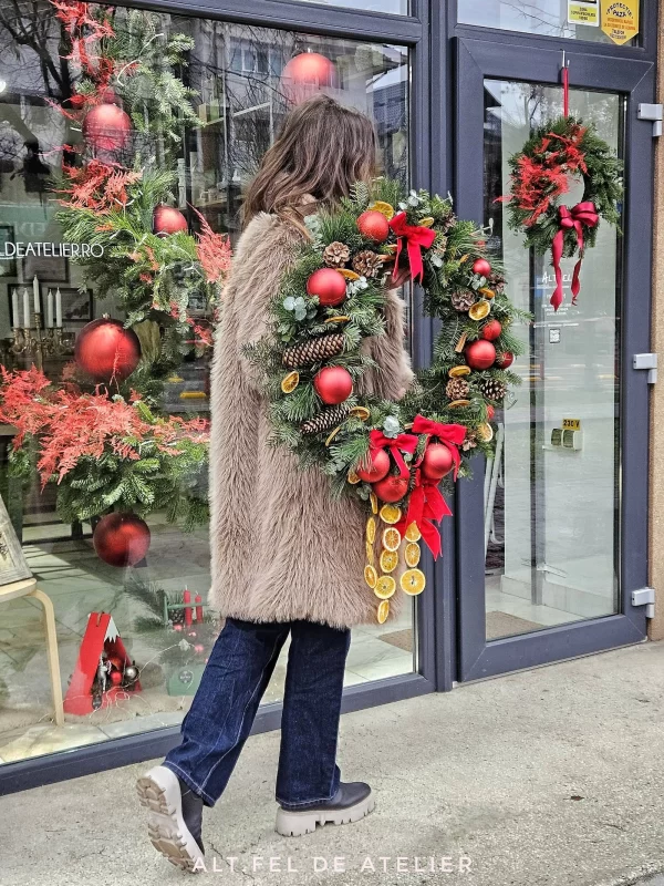 Coronita de Craciun este realizata cu crengi de brad natural, accesorizata cu figurine, globuri si alte accesorii specifice sezonului rece.