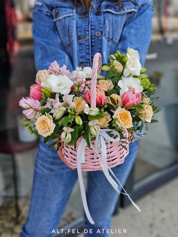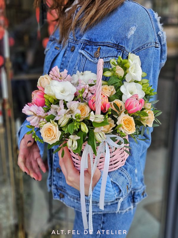 Aranjament  „Coş de primăvară” este alcătuit din alstroemeria, frezii,  lalele, mini trandafiti, robusta.