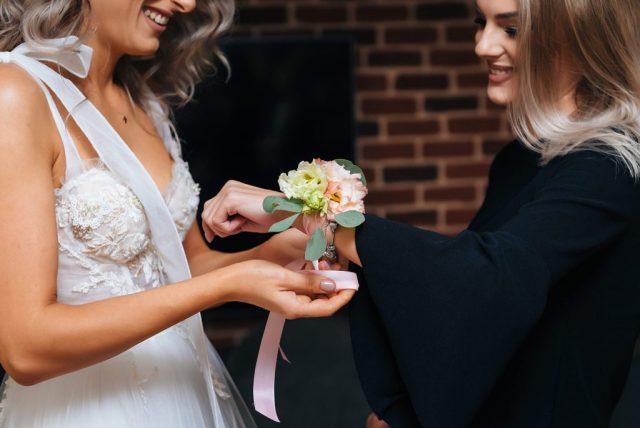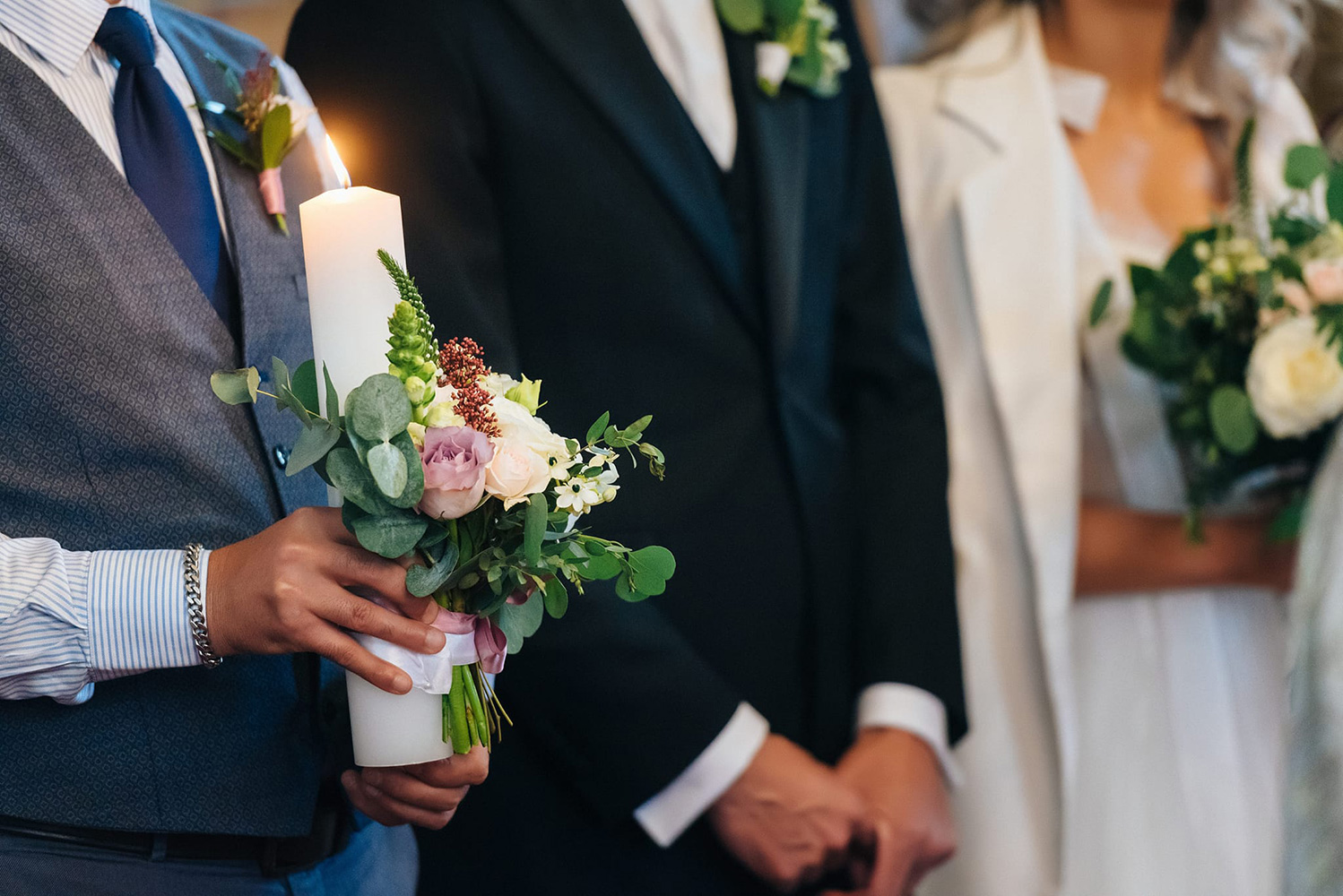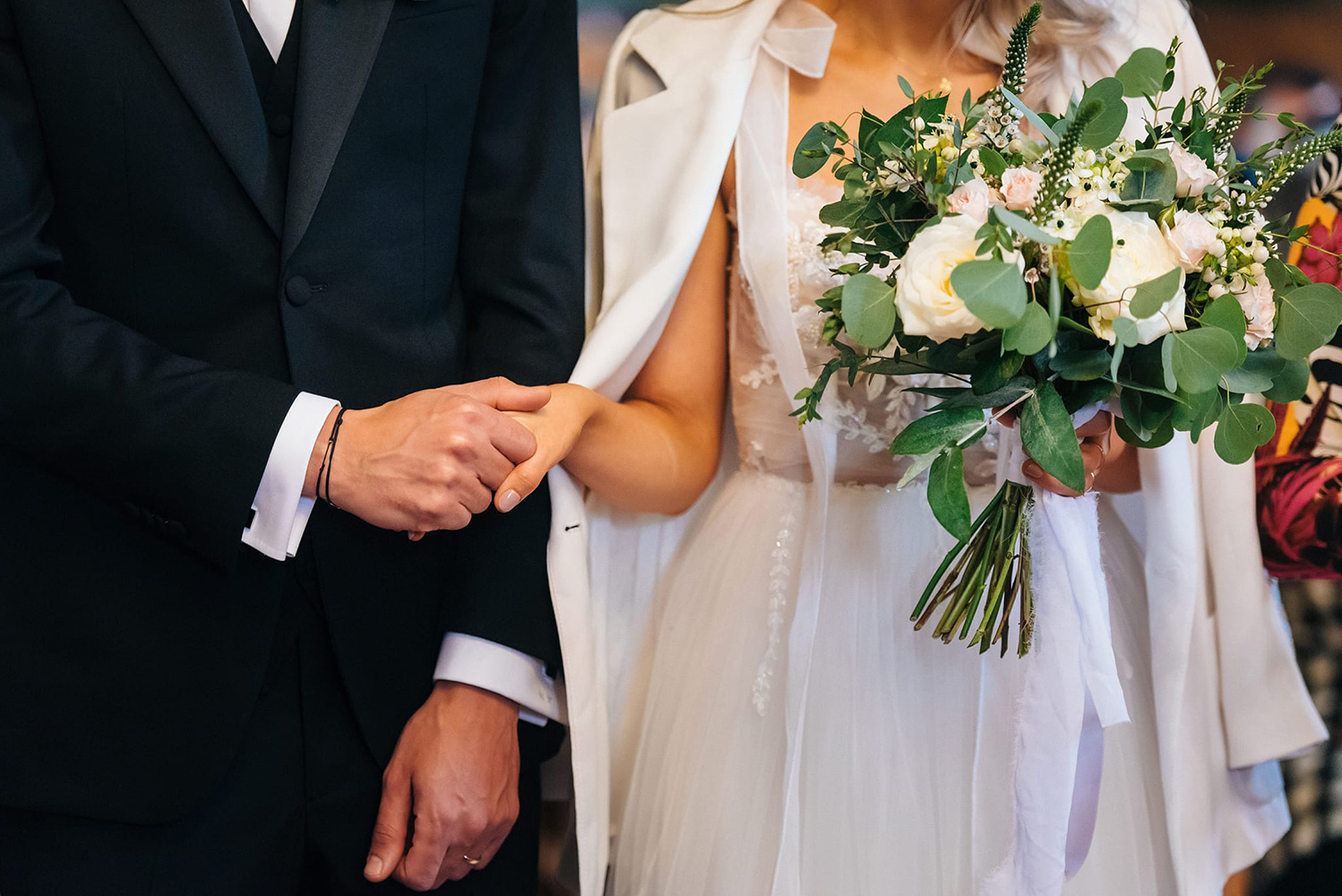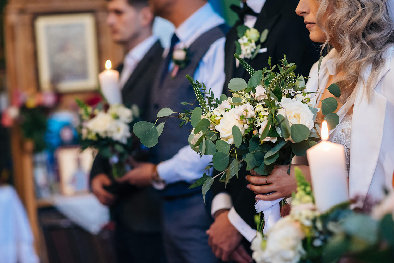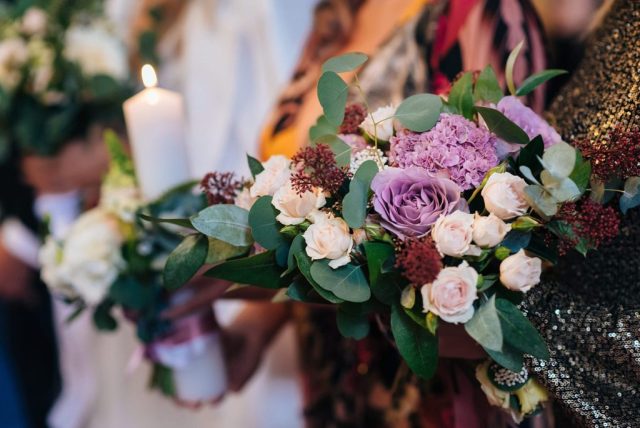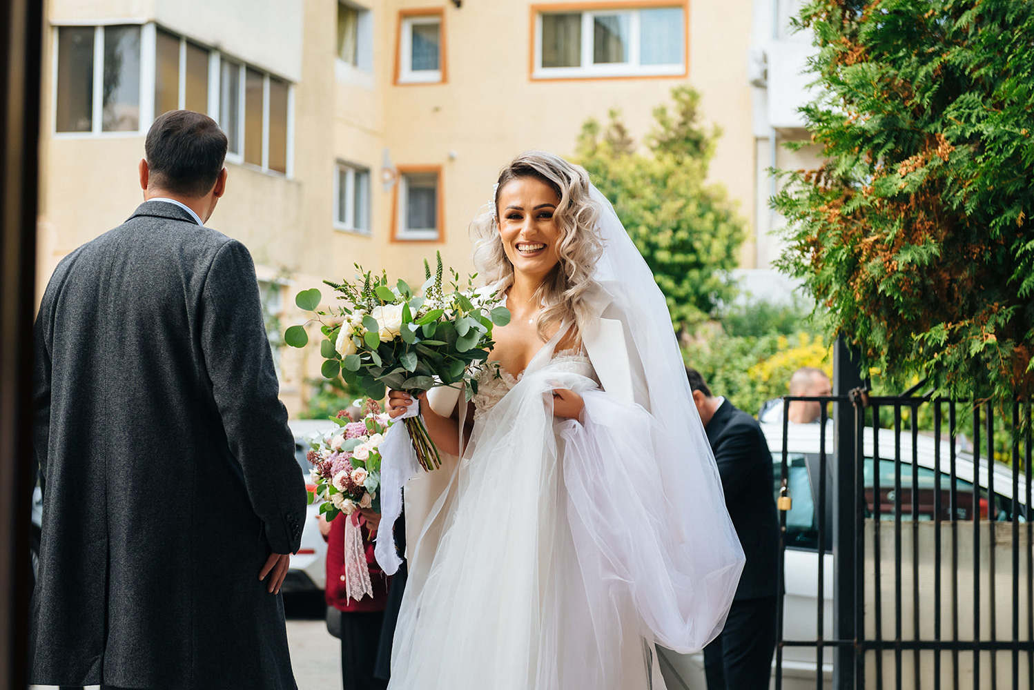 Buchetul Andreei a fost compus din flori albe si insertie de verdeata, deloc compact, cu o nota de eleganta si o tenta jucausa, iar buchetul nasei a fost compus din flori mov cu insertie de grena si verdeata.