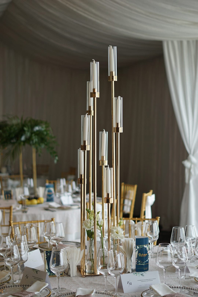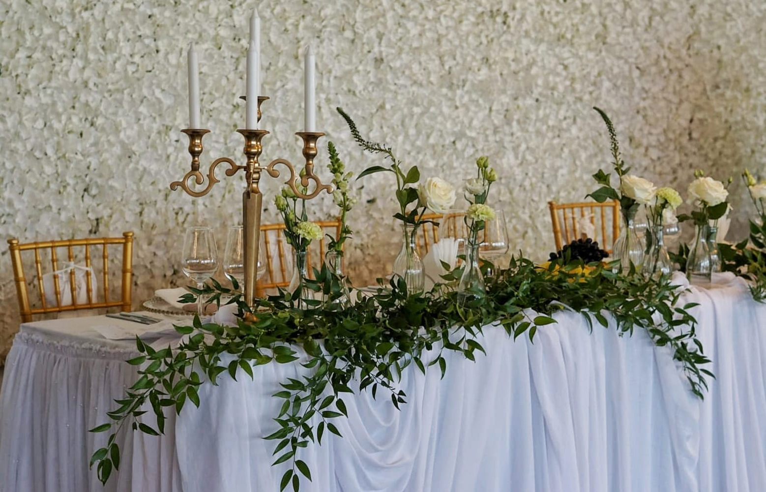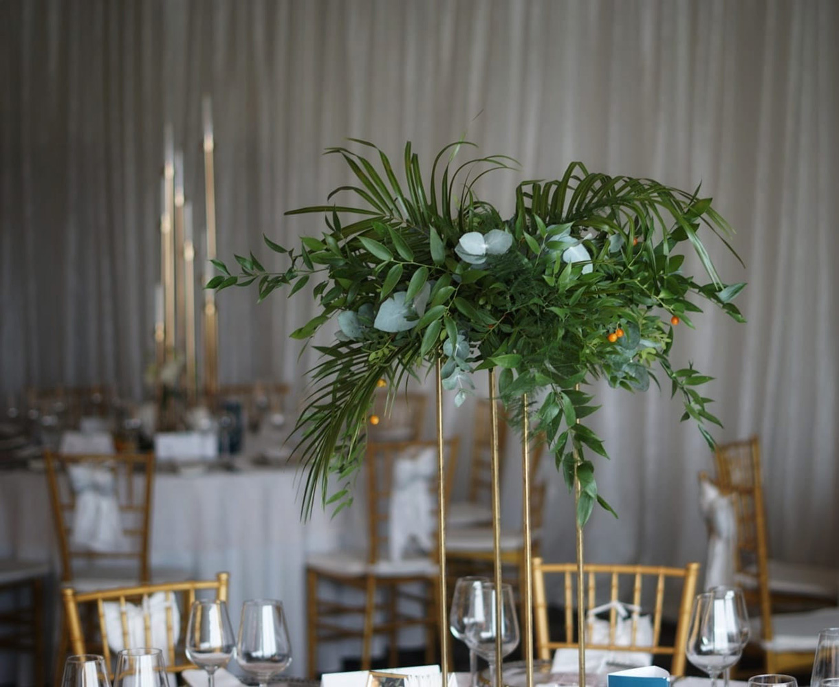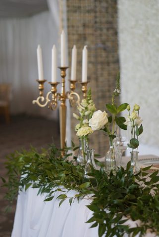 Impreuna cu Andreea am ales sa ne jucam cu nuantele de alb si verde. Am mixat aranjamentele pentru mesele invitatilor cu aranjamente all green si aranjament format din sfenic 8 brate auriu cu flori in vaze la baza, pentru decorul mesei de prezidiu am ales flori in vaze, elente aurii si ghirlanda de verdeata.